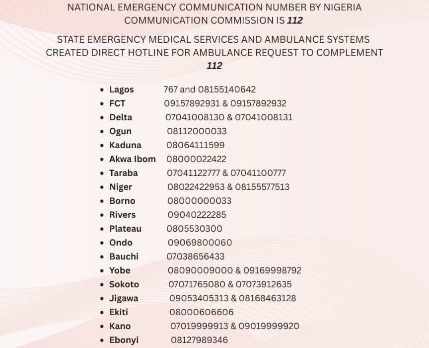 According to information released by the National Emergency Medical Service and Ambulance System, the Nigeria Communications Commission (NCC) has designated 112 as the official national emergency communication number, accessible across the country for medical emergencies and other urgent situations.