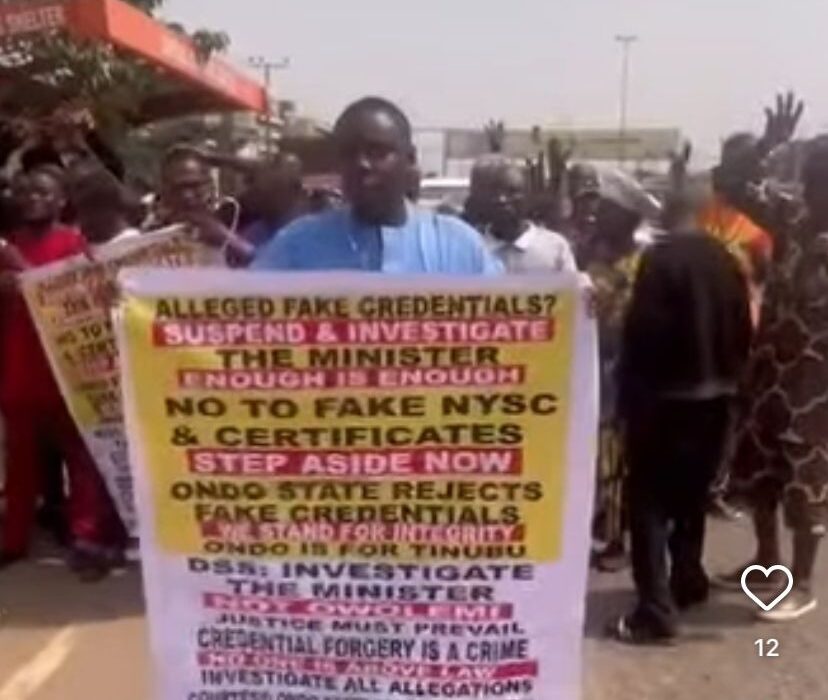 Placards at the protest bore inscriptions including “Suspend and Investigate the Alleged Minister with Fake Credentials,” “DSS: Investigate the Minister, Not Owolemi,” “No to Fake NYSC and Certificates,” and “Credential Forgery Is a Crime, No One Is Above the Law.” Another read, “Ondo State Rejects Fake Credentials. We Stand for Integrity. Ondo Is for Tinubu.”